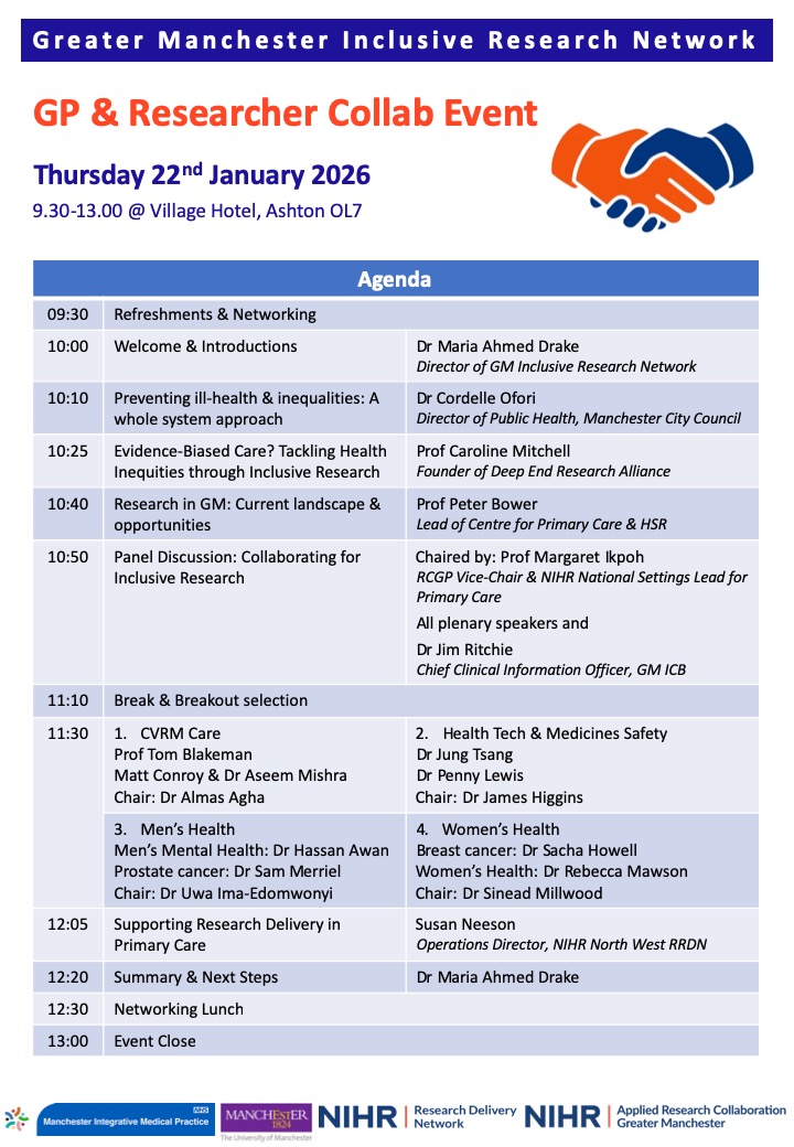 We thank all of our delegates and speakers for their engaging and enthusiastic contributions to our event. Special thanks to the NIHR GM-ARC team Sue Wood, Joanna Triggs and Carly Rolfe who’s consummate professionalism ensured that the event ran as smoothly as possible. The GM IRN and this event has been funded through the NIHR North West RRDN Strategic Funding Award 2025/2026.