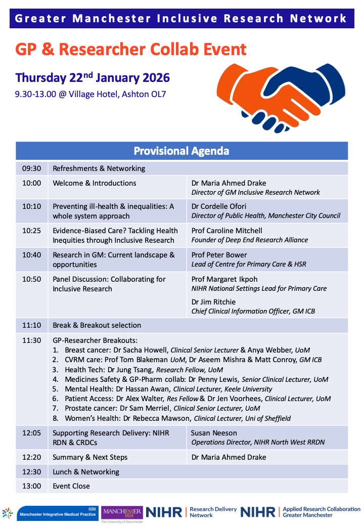GP & Researcher Collaboration Event: Thurs 22/01/26 9:30-13:00 at Village Hotel, Ashton. This event invites GPs and Research teams serving deprived populations (deciles 1 to 4); Health Inequalities Leads and Researchers to connect and collaborate to (i) learn about successful models of GP-researcher collaboration (ii) co-design research to improve health outcomes and tackle health inequalities and (iii) shape strategy in inclusive primary care research and innovation across GM and beyond. Free parking, refreshments and networking lunch included. Provisional agenda below – New speakers announced!